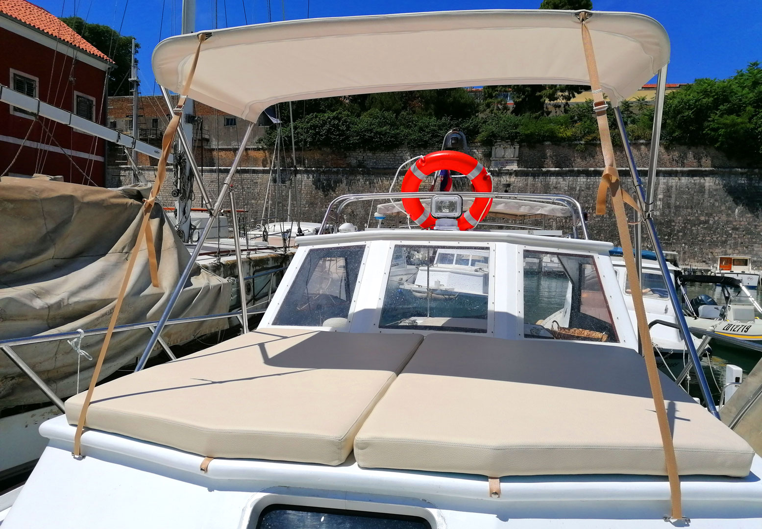 Naše brodske tende, uz zaštitu putnika od sunca i kiše uključuju i zaštitne presvlake bilo pojedinih dijelova ili cijelog broda.